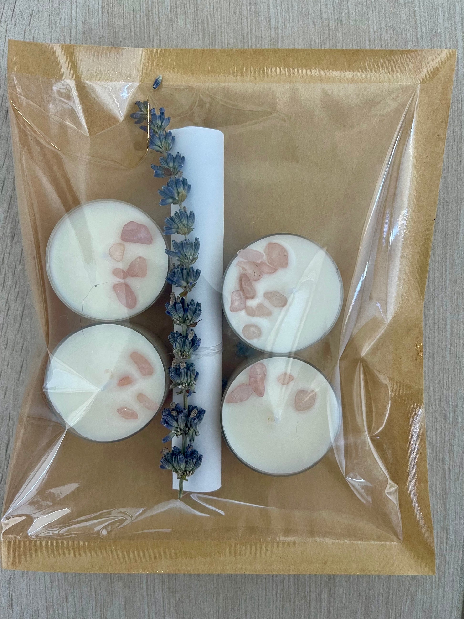Each blush-pink tealight is delicately infused with genuine rose quartz — the stone of unconditional love and emotional healing. As the candle burns, it gently opens the heart space, inviting in compassion, peace, and feminine grace.